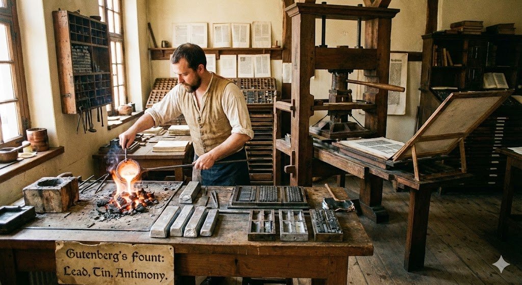 Gutenberg desenvolveu uma liga de chumbo, estanho e antimônio que derretia a baixa temperatura, se solidificava rapidamente e era durável o suficiente para suportar milhares de impressões. Era o material perfeito para fabricar tipos móveis.