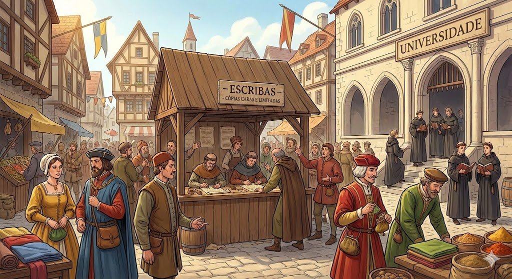 Gutenberg viveu durante um período conhecido como Idade Média tardia e início do Renascimento — uma época de grandes transformações na Europa. A Igreja exercia enorme influência sobre a vida das pessoas. As universidades começavam a se multiplicar. O comércio crescia, e com ele surgia uma nova classe de cidadãos com dinheiro e interesse em aprender: a burguesia. Era um momento em que as ideias queriam circular, mas os meios para isso ainda eram escassos e caríssimos.